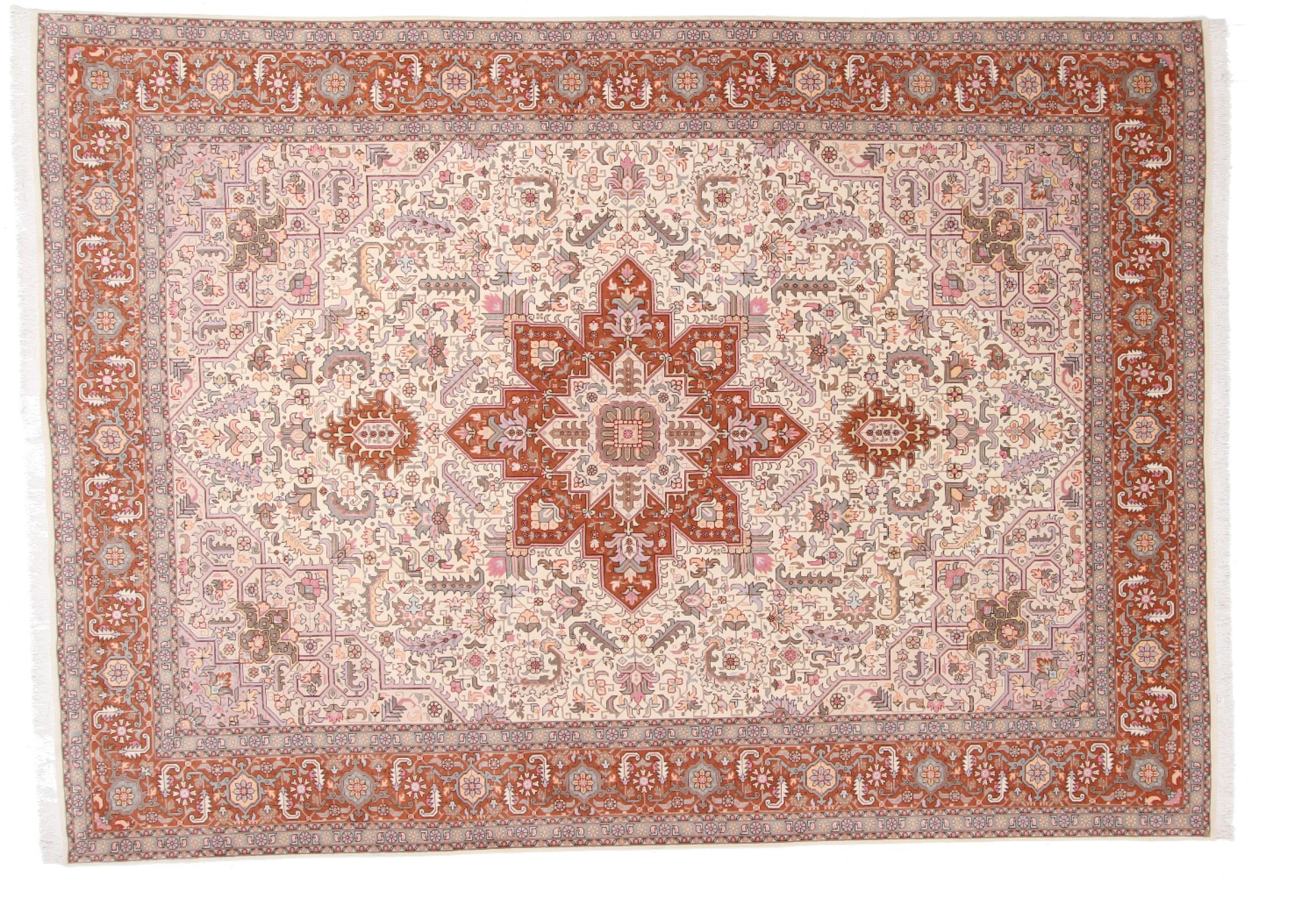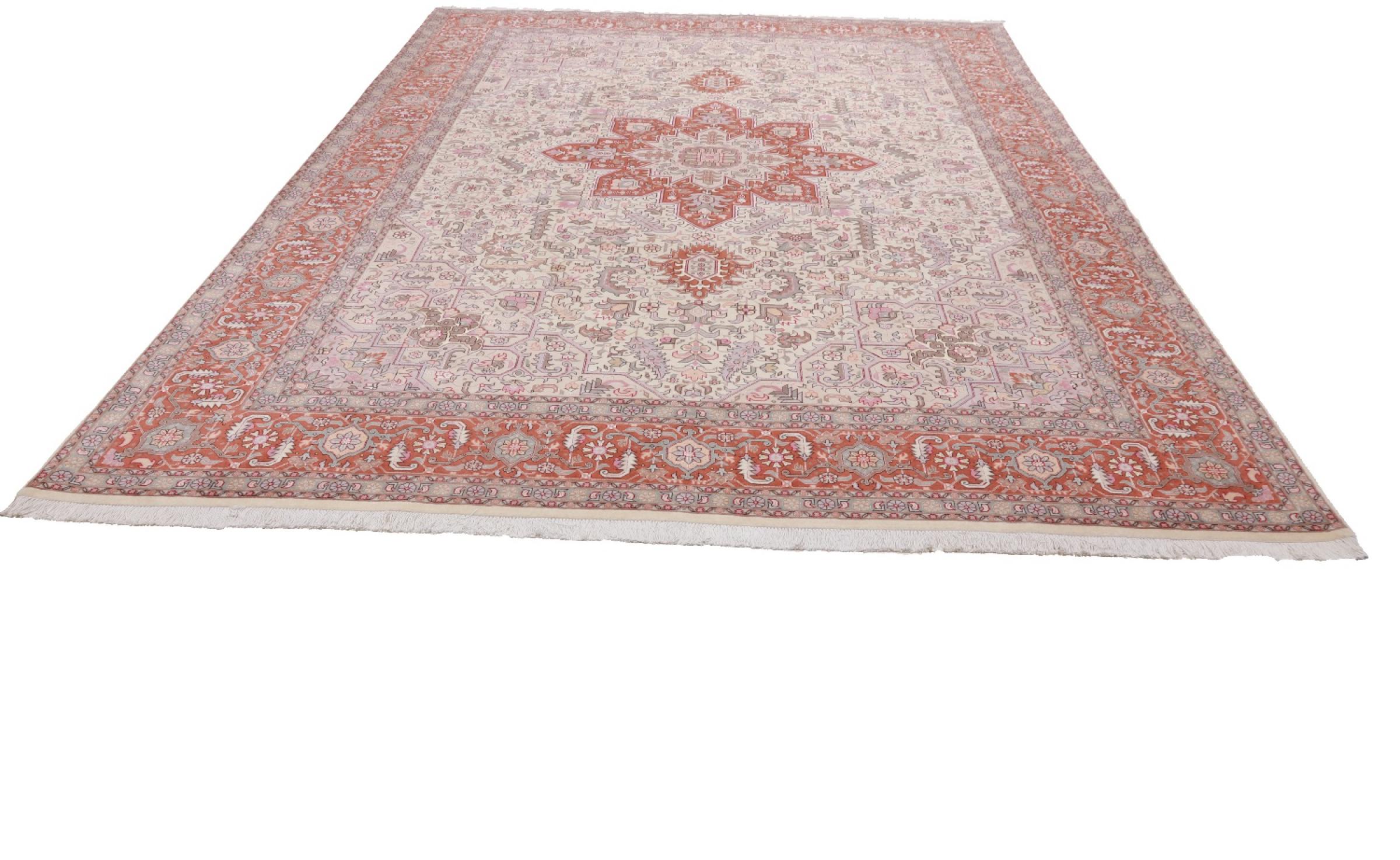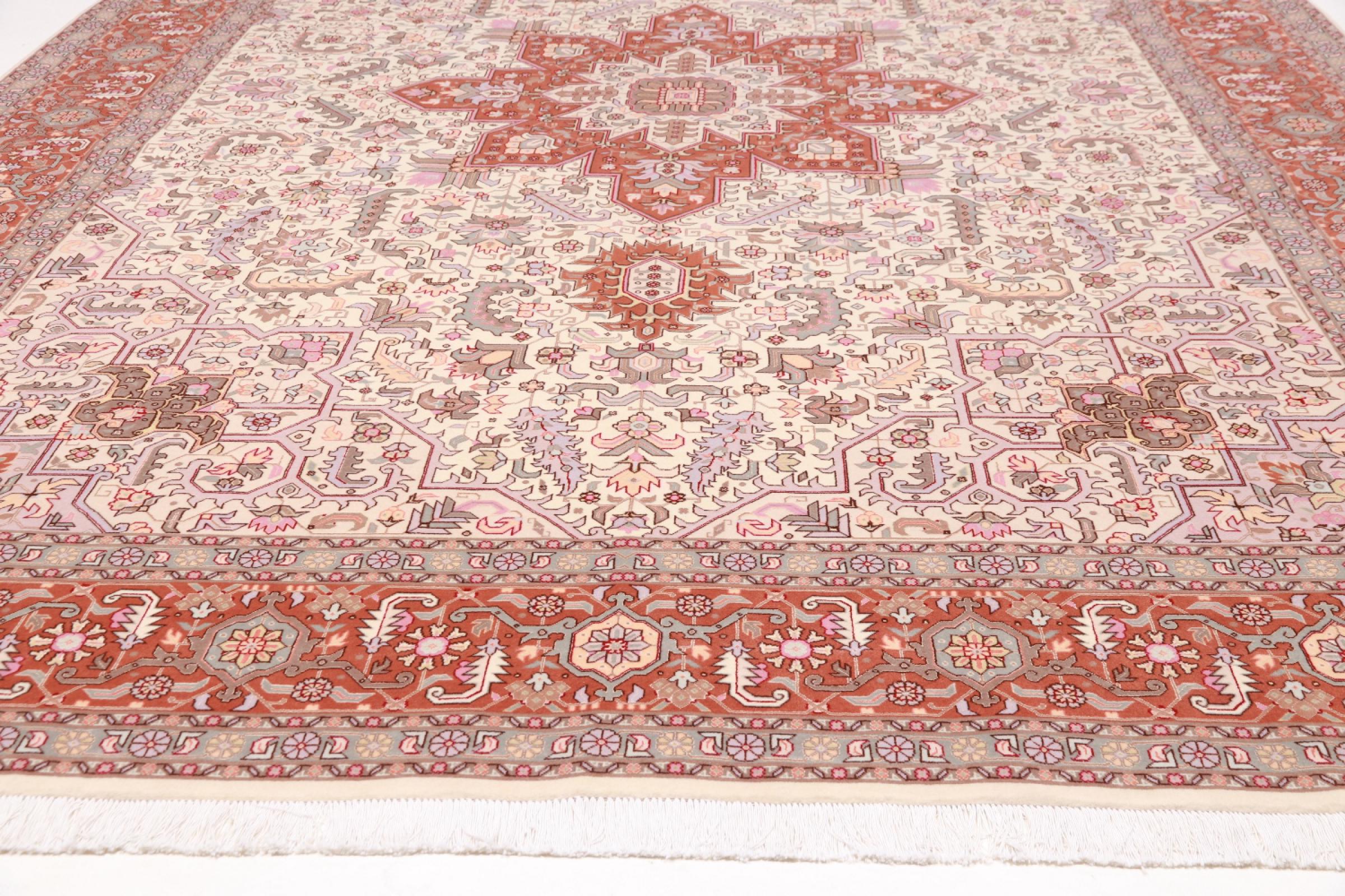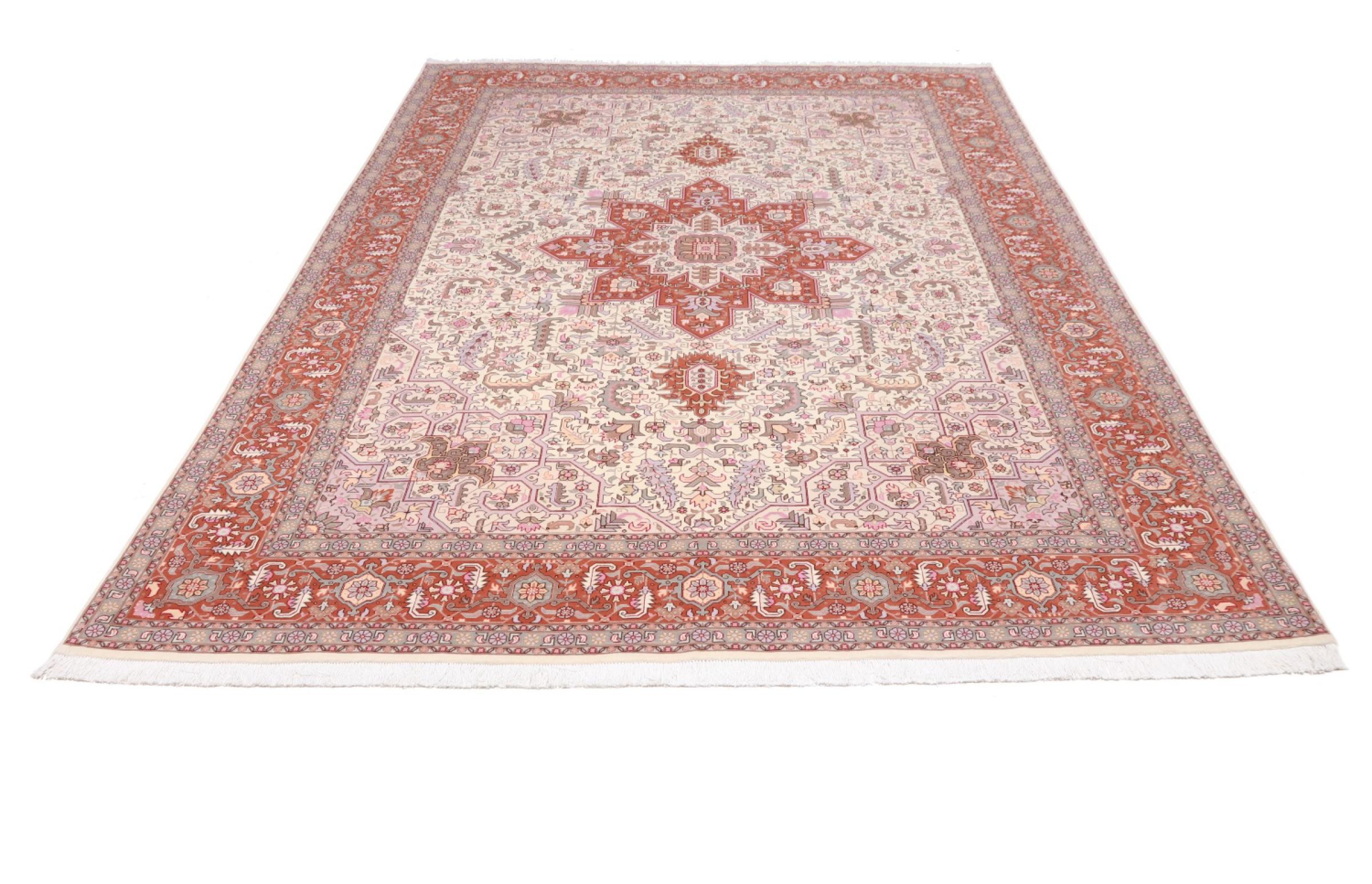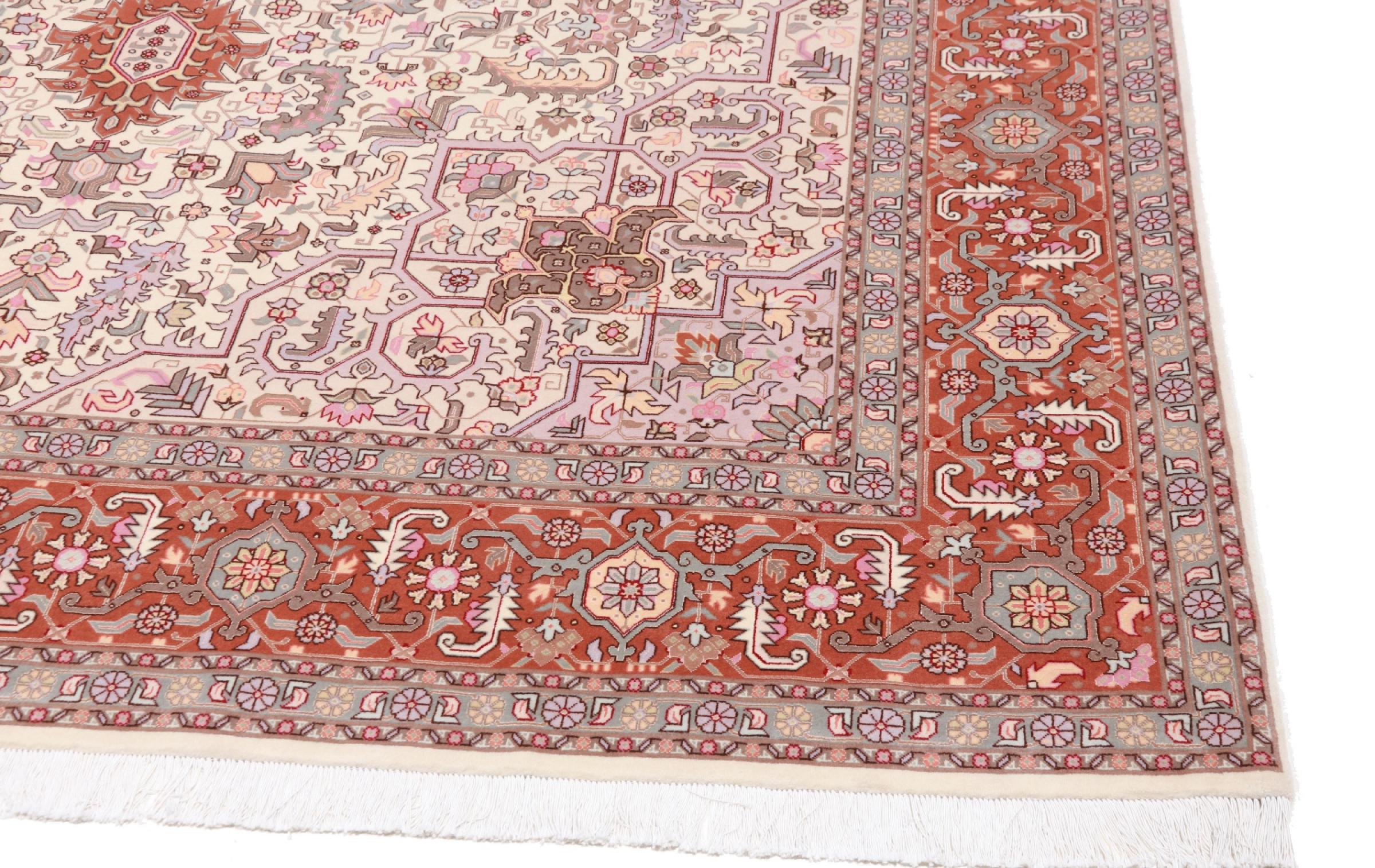 Tæppe-nr.: 48690051084 Størrelse: 362x256 cm Tykkelse: ca. 7 mm Knuder: 450 000 - 500 000 / m² Forarbejdelse: Knyttet i hånden Luv: Uld med silke Kæde: Bomuld Oprindelse: Persien / Iran Alder: Ny Vægt: ca. 28 kg Også kendt som Tabriz, Tabris, Täbris, Tebriz, Tebris, 40Raj, 50Raj Antal på lager: Unik - Kun 1 tilbage på lager