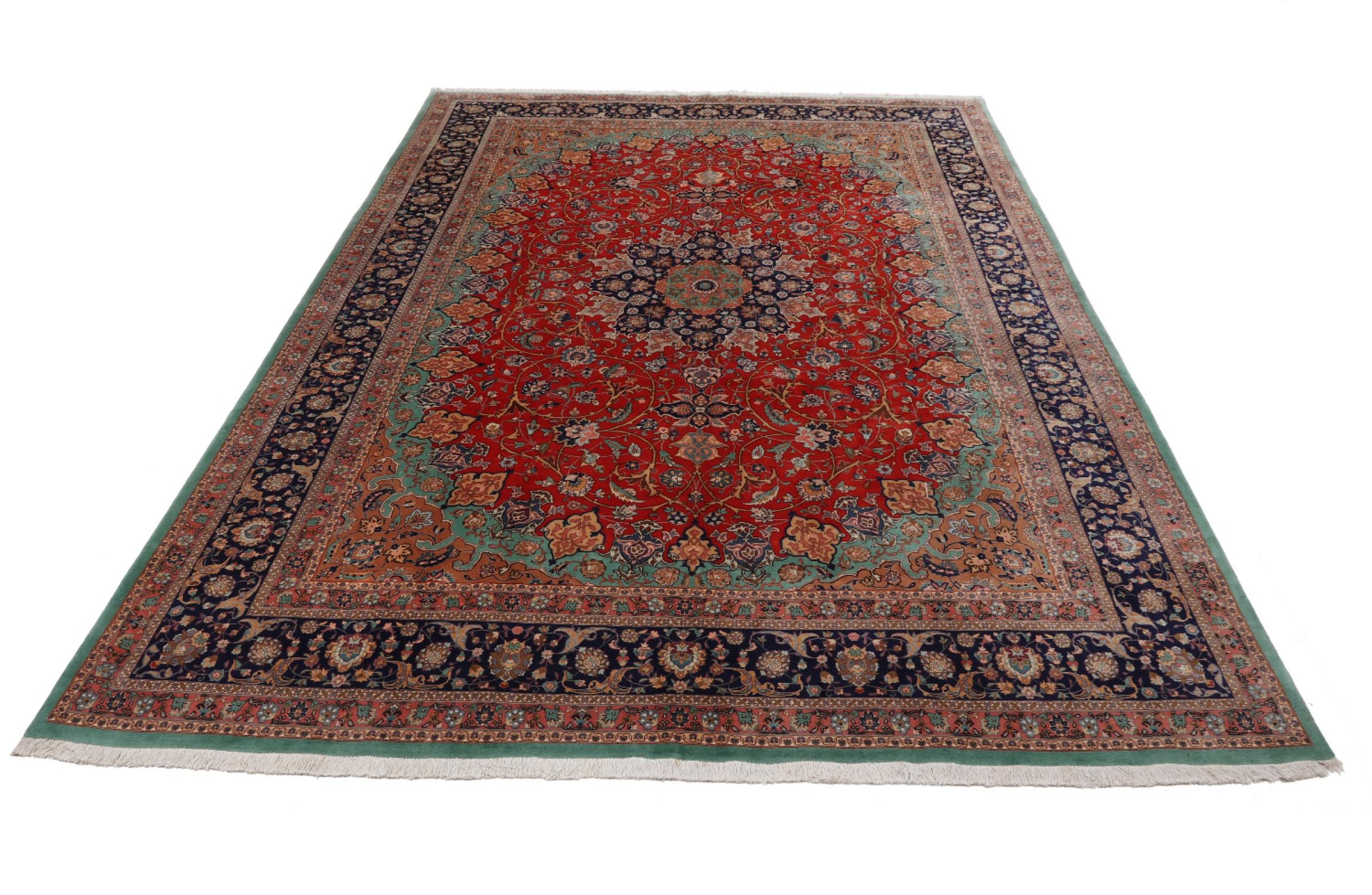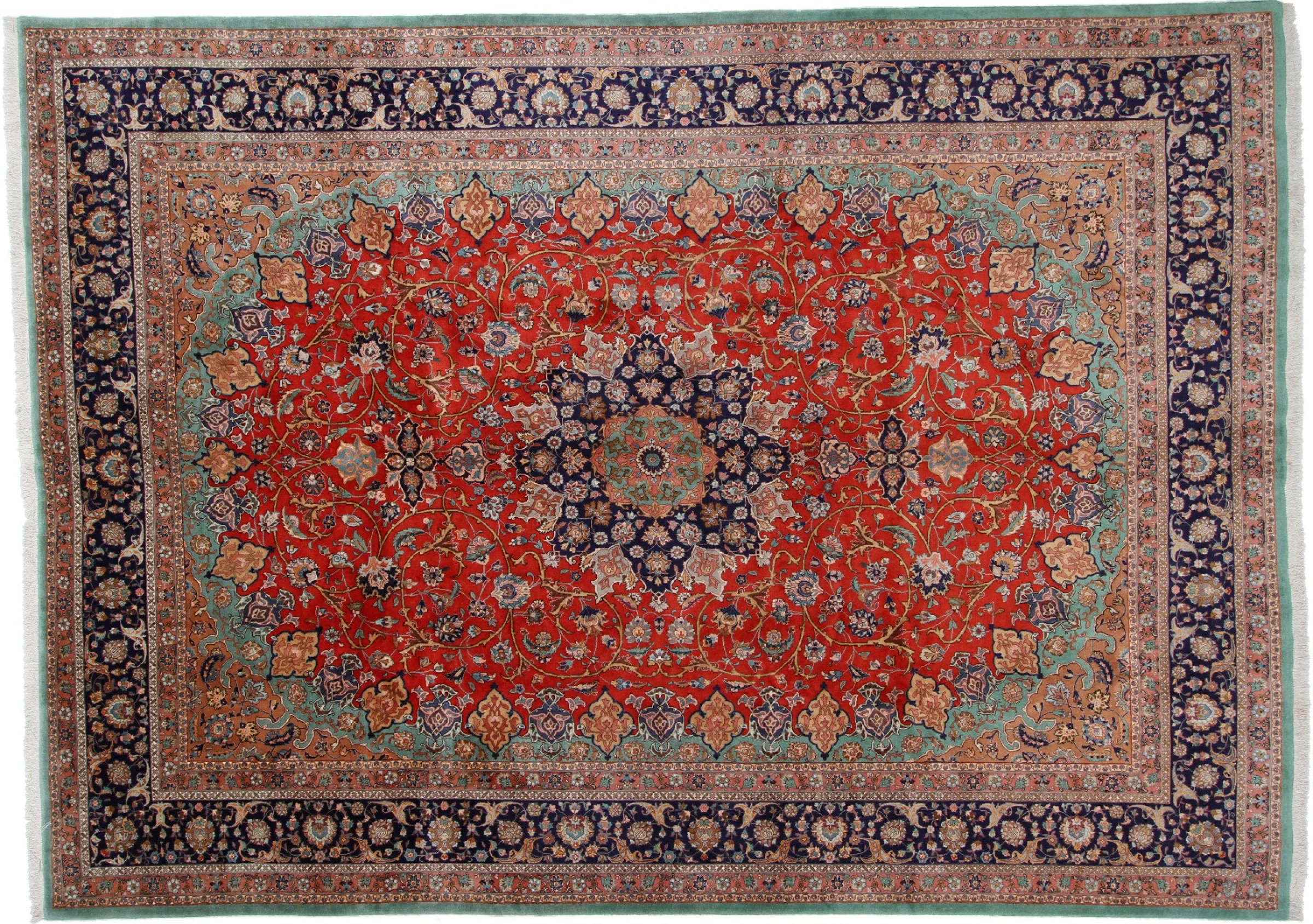 Tæppe-nr.: 34925004969062 Størrelse: 404x297 cm Tykkelse: ca. 6 mm Knuder: 650 000 / m² Forarbejdelse: Knyttet i hånden Luv: Uld med silke Kæde: Silke Oprindelse: Persien / Iran Alder: Ny Vægt: ca. 36 kg Også kendt som Tabris, Tabriz, Tebris, Tebriz, Täbris, 60Raj Antal på lager: Unik - Kun 1 tilbage på lager