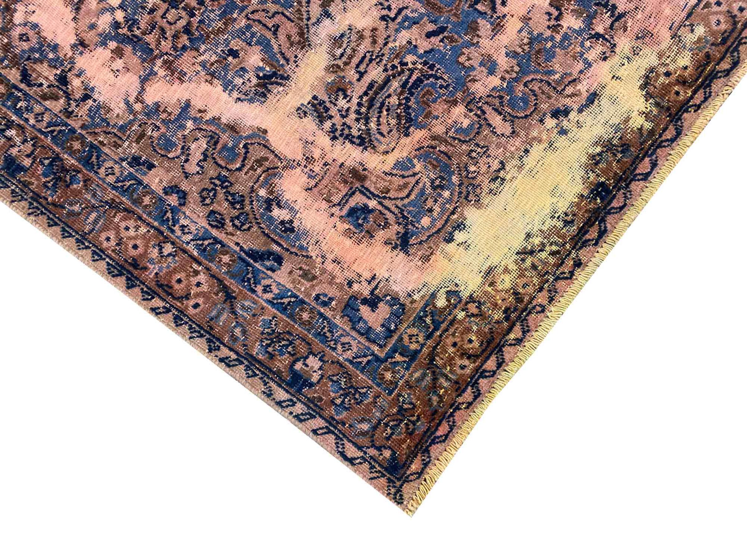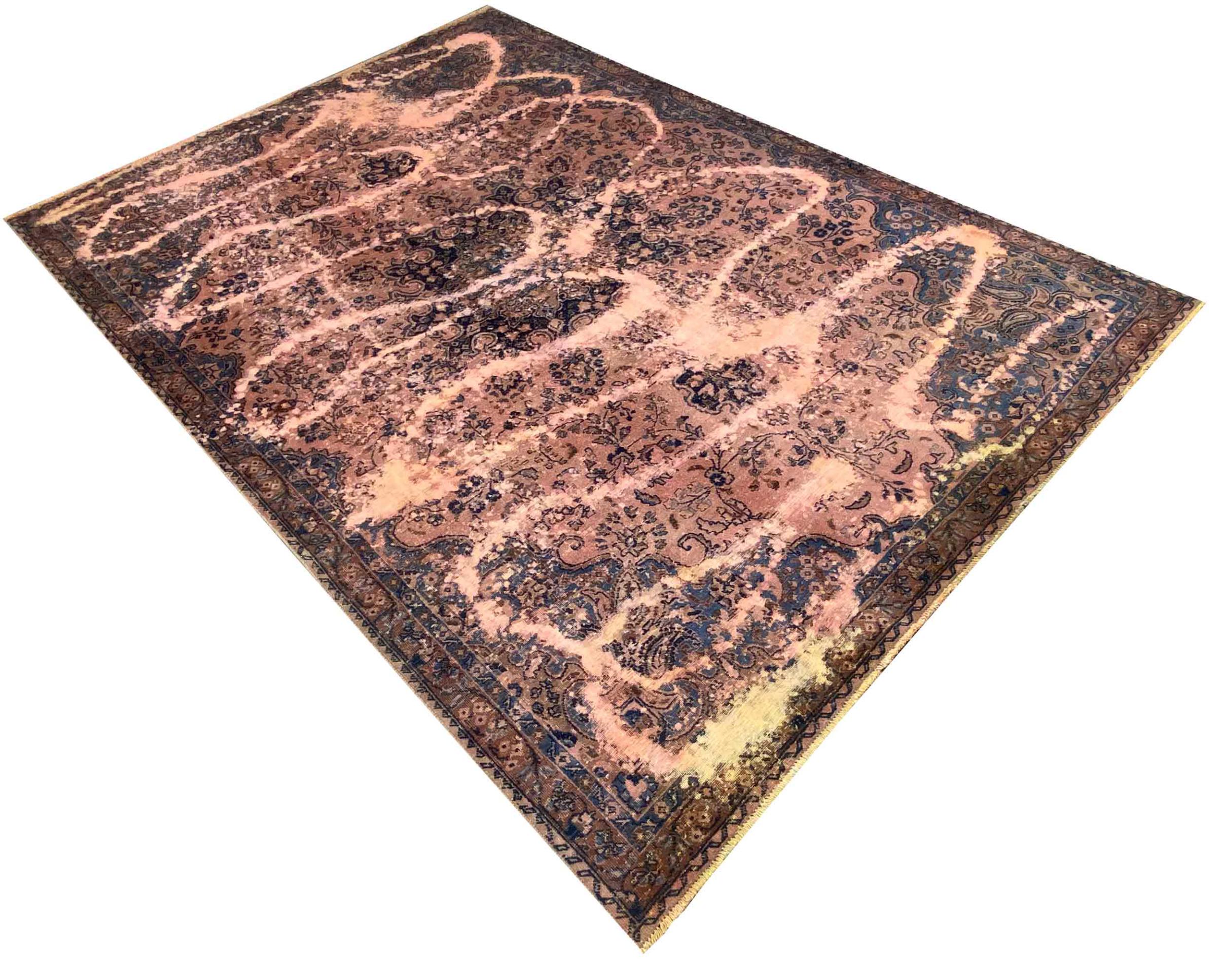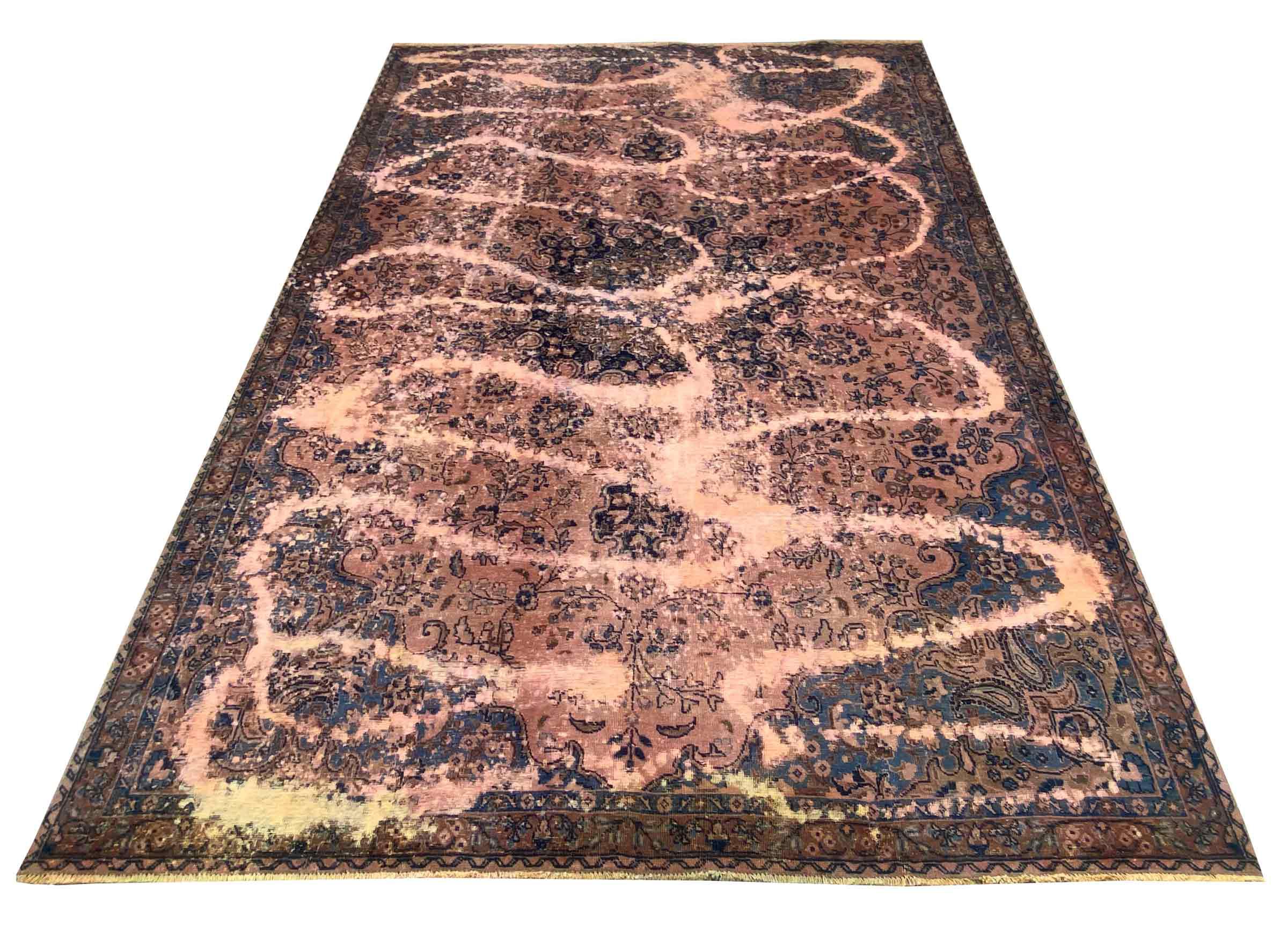Dette er et håndknyttet persisk tæppe, som er mindst 20 år gammelt. Sådan et tæppe kan holde i generationer med den rette pleje. Tæppet er blevet fuldstændig genfarvet uden helt at overfarve de oprindeligt knyttede ornamenter. Det giver det persiske tæppe af høj kvalitet en unik moderne vintage-karakter.